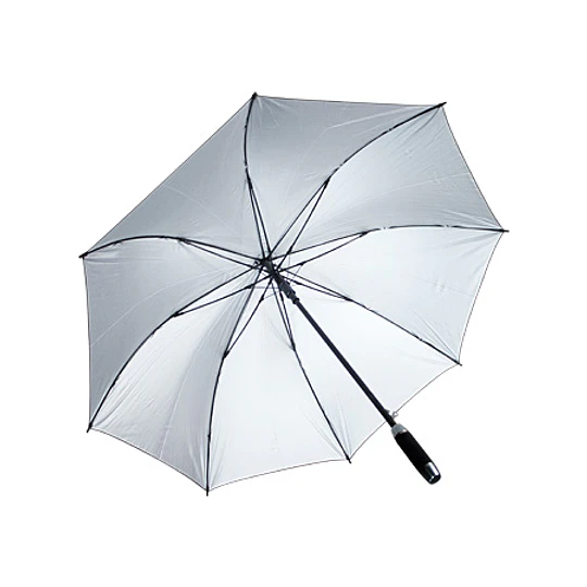 Deluxe Paraguas de Golf con 8 cascos de tela 190T PONGEE reverso cobertura plateada con protección UV. Cuerpo y varas reforzadas de Fibra de Vidrio, sistema de apertura automático. Mango recto de EVA negro y aluminio anodizado. Incluye funda al tono de 190T PONGEE.